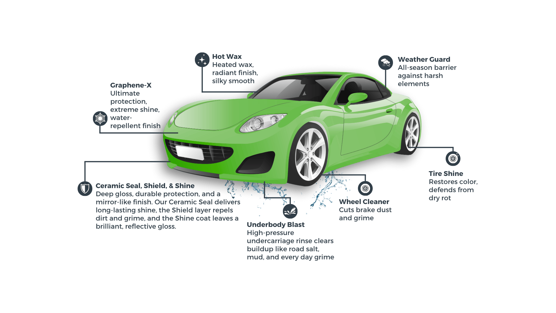 Hot WaxHeated Wax, radiant finish, silky smoothAll-season barrier against harsh elementsWeather GuardRestores color defends from dry rotTire ShineWater Repellent finish, for extreme shine and ultimate protectionGraphene-XCeramic Seal, Shield, & ShineDeep gloss, durable protection, and a mirror- like finish. Our Ceramic Seal delivers long-lasting- shine, the Shield layer repels dirt and grime, and the Shine coat leaves a brilliant, reflective finish.Cuts brake dust and grimeWheel CleanerUnderbody BlastHigh-pressure undercarriage rinse clears buildup like road salt, mud, and everyday grimeAdvanced TechnologyWinner's Circle Ready